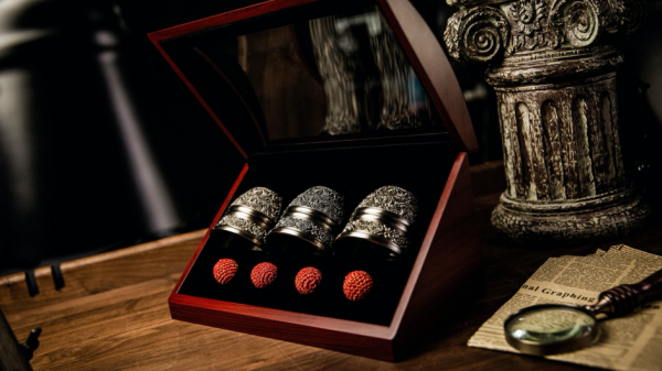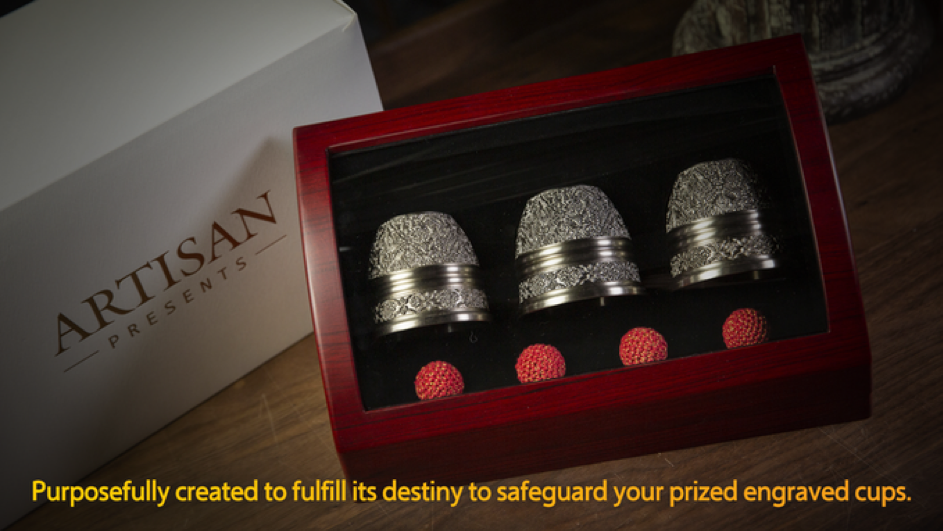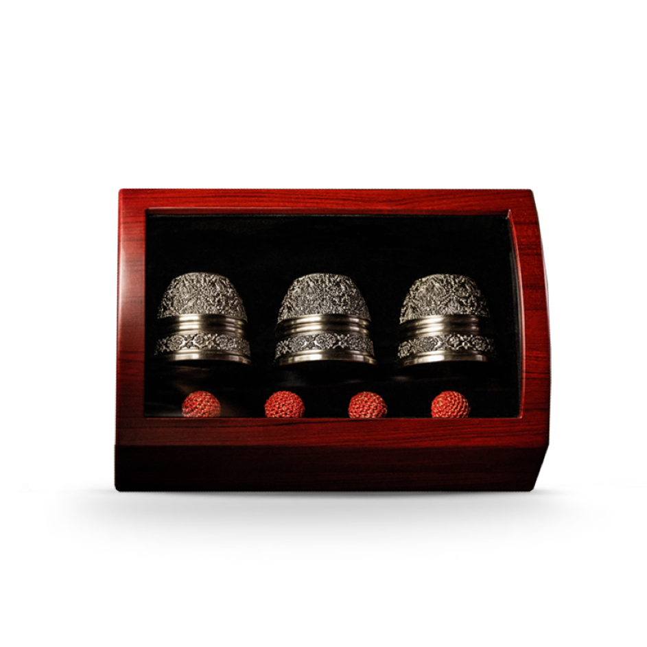 - L’ensemble est composé de : mousse de coton antichoc×2+boîte en bois de collection+tasse gravée×3+boule en soie dorée×4