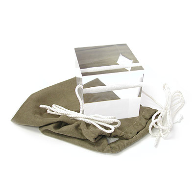 Using a polished four-inch (10 X 10 cm) solid block of Acrylic, you thread a nylon cord through the center of the block not once but twice.