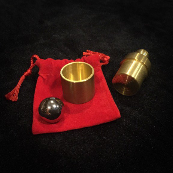 Ce tour est un des plus grand défit de production. Cette pièce de précision en magie défie la logique. Un beau petit piston en laiton, un petit récipient creu en laiton et petite une bille d’acier forment ensemble ce qui fait désormais partie des classiques de la magie.