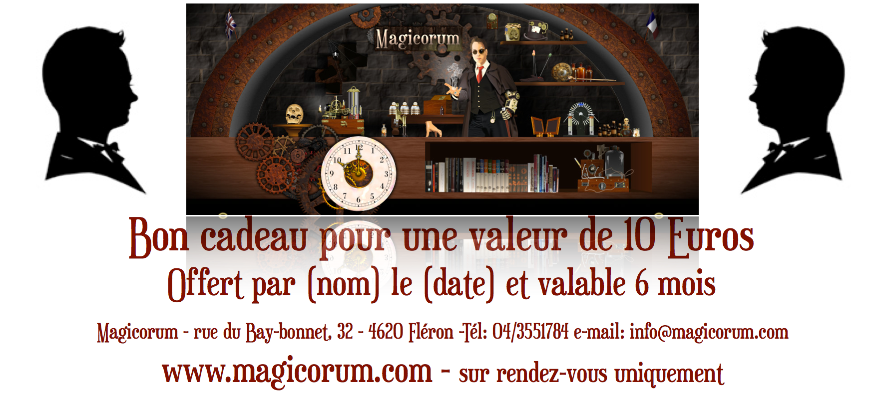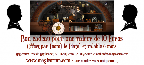 Une fois le bon cadeau acheté et reçu, vous pourrez enlever le ou les articles de votre choix physiquement uniquement sur rendez-vous à notre bureau ou en envoyant par e-mail la liste des articles souhaités que vous voulez effectivement recevoir par la poste (frais de port en supplément): info@magicorum.com