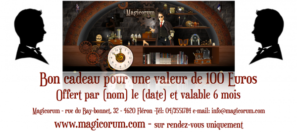 Une fois le bon cadeau acheté et reçu, vous pourrez enlever le ou les articles de votre choix physiquement uniquement sur rendez-vous à notre bureau ou en envoyant par e-mail la liste des articles souhaités que vous voulez effectivement recevoir par la poste (frais de port en supplément): info@magicorum.com