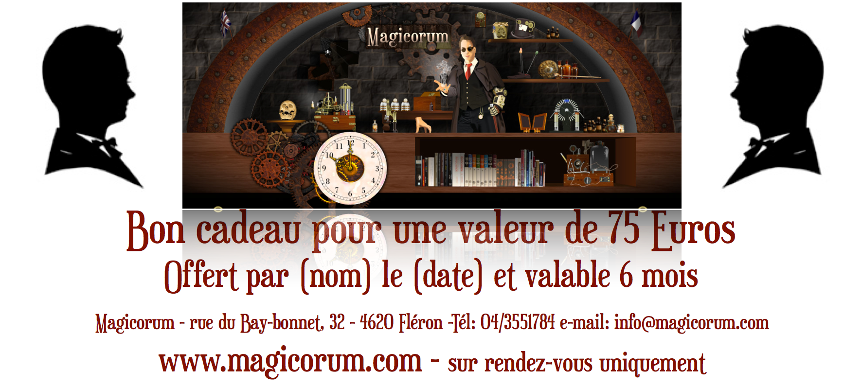 Une fois le bon cadeau acheté et reçu, vous pourrez enlever le ou les articles de votre choix physiquement uniquement sur rendez-vous à notre bureau ou en envoyant par e-mail la liste des articles souhaités que vous voulez effectivement recevoir par la poste (frais de port en supplément): info@magicorum.com