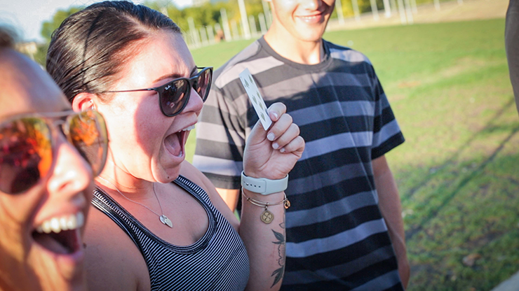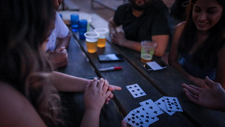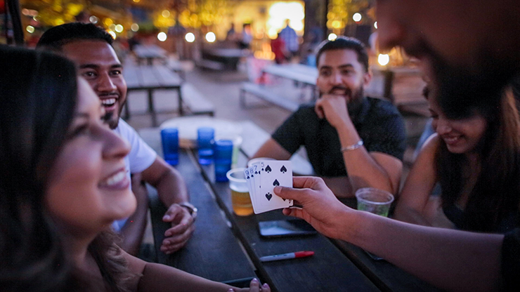 This is a mind-blowing effect that is sure to amaze any audience. A spectator counts 10 cards, which are then divided into two packets of 5 cards each. One packet is given to a second spectator to hold, sit on, or place in his pocket etc. The first spectator then merely THINKS of one of his cards, before securing them between his hands.
