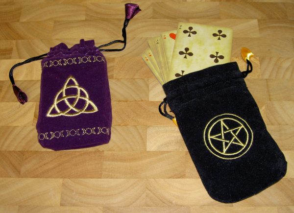 Available in two different versions, black with a Pentacle stitching or purple with a tripple goddess stitching.