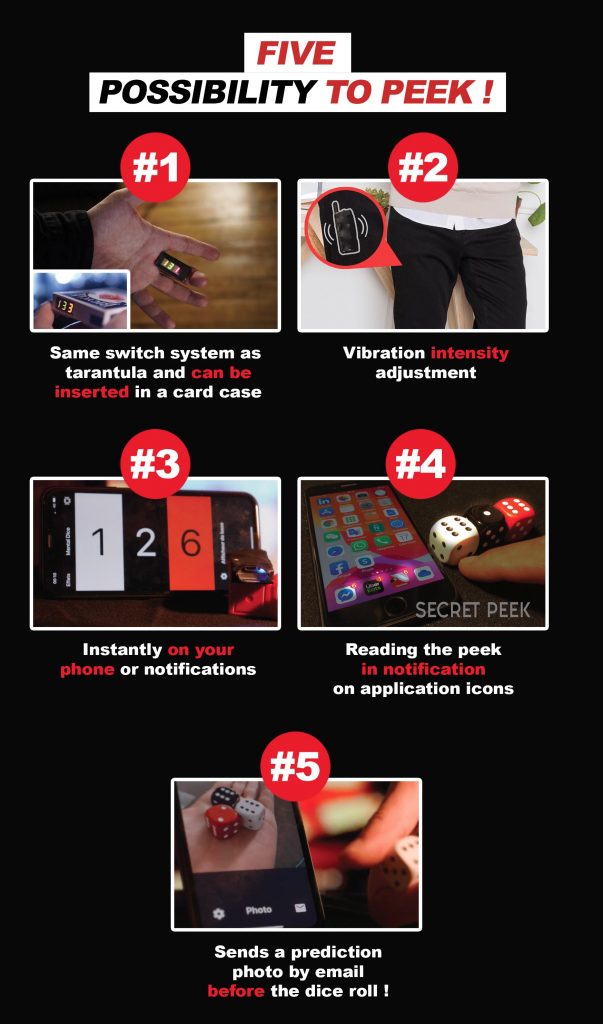 Invite your spectator to fully examine and roll the three dice, with your back turned, you PREDICT the NUMBER and COLOR of EACH die with steadfast conviction. You are prepared for this moment. You hand the dice to another spectator, but this time you LEAVE the room, they roll the die, incredibly, you are able to foresee (with 100% success) the number rolled and corresponding. And it’s not over yet. You can, thanks to Kinetic Mental Dice, know exactly what position all the dice are in, whether they are in the spectator’s hand, under a cup or even in another room with a PK RING or the magnetic equivalent. Meticulously created and designed by Marc Antoine, the value and quality of all components is unequalled. Each product has been developed with a critical and intelligent eye. The effect includes the vibrator-receiver (Thumper), a free smartphone application and a 2-year warranty.