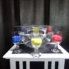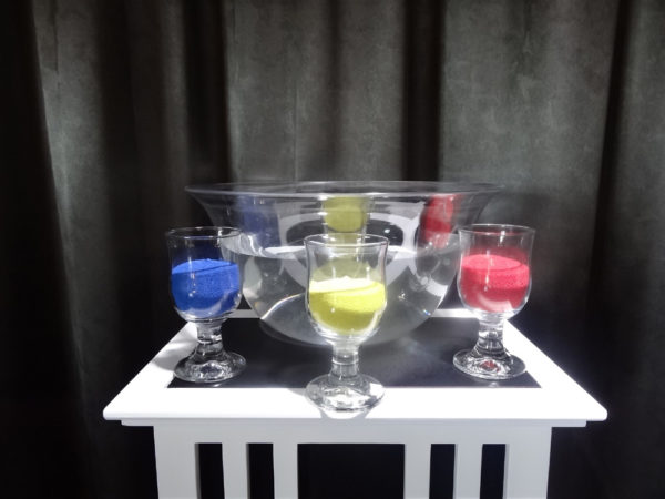 Vous présentez à votre public une vasque vide et transparente (vous pouvez la montrer sous toutes ses coutures : devant, derrière, sur les côtés, dessous, dedans, partout, partout…). Vous la remplissez d’eau à l’aide du récipient de votre choix (un tuyau d’arrosage, un arrosoir, ou plus simplement une bouteille). Vous montrez ensuite trois récipients pleins de sable de couleurs différentes.