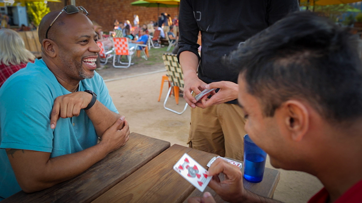 Deux cartes à jouer séparées sont sélectionnées et affichées proprement des deux côtés. Lentement et équitablement, les deux cartes sont pressées l’une contre l’autre et « transformées » en une carte d’aspect très bizarre qui montre les deux couleurs et valeurs différentes sur sa face ! Cette carte très spéciale créée par magie peut être entièrement examinée ou même donnée pour un souvenir inoubliable !