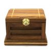 The casket measures approximately 12.5cm wide by 10cm tall and 9cm deep and has been painstakingly handcrafted from natural aged teak wood with beautiful inlay work and a lightly distressed oil finish.