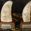 Le Scrimshaw est une pièce d’art qui fut développée au 19e siècle sur les bateaux de chasse de baleine. Les marins utilisaient des aiguilles et de l’encre pour faire de l’art sur les os ou les dents de baleine.
