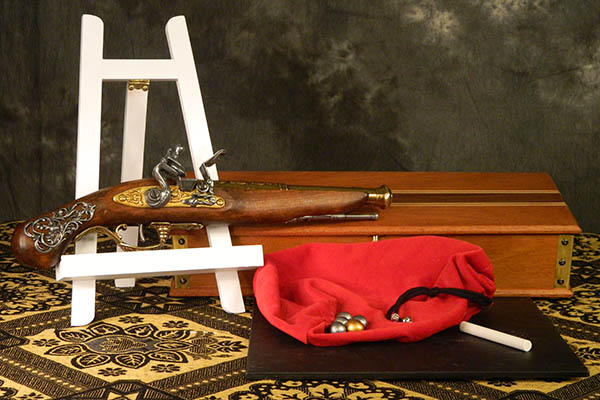 The performer opens the box and inside there is a flint stock pistol. He turns the pistol over and shows a metal skull in the stock of the pistol. He then pays attention to a tattoo on the spectators arm – A matching skull.
