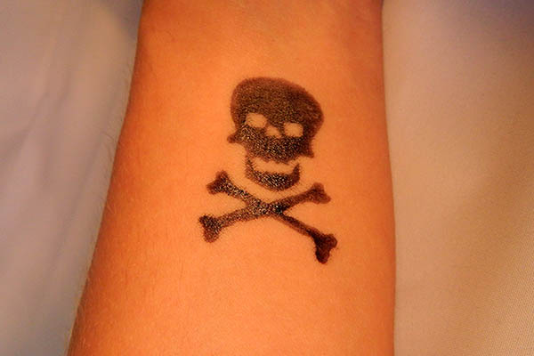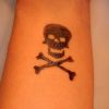 Le magicien ouvre la boîte et à l’intérieur il y a un pistolet à silex. Il retourne le pistolet et montre un crâne en métal sur la crosse du pistolet. Il attire ensuite l’attention sur un tatouage visible sur le bras du spectateur. Un crâne avec des os s’y trouve également!