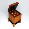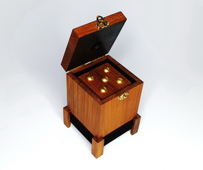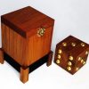 La boîte mesure environ 8,3 cm de large, 13,2 cm de haut et 8,3 cm de profondeur et a été entièrement fabriquée à la main en teck naturel vieilli avec une finition à l’huile légèrement vieillie. Le dé est également fabriqué à la main en bois de teck et est finement orné de 21 vis en laiton.