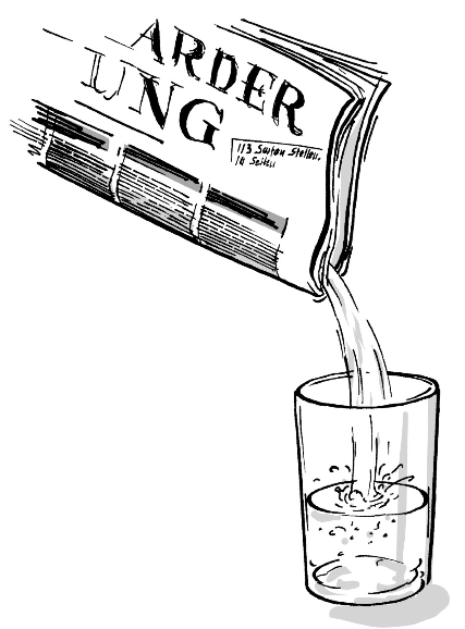 Vous tenez un journal en main et vous montrez que rien n’est cache à l’intérieur. Puis vous le pliez trois fois et vous versez le contenu d’un verre d’eau à l’intérieur. Le journal est ensuite déroulé et à la stupéfaction des spectateurs, même la tête en bas, complètement retourné, l’eau a disparu comme par magie. Encore une fois, le journal est plié et l’eau en ressort depuis une certaine hauteur directement dans le verre.