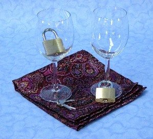 Vous remettez un cadenas en laiton solide à un membre de l’auditoire et demandez-lui d’ouvrir la serrure. Ce n’est pas possible sans la bonne clef, bien sûr. Vous sortez un verre de vin qui possède un long pied fin contenant une clef appropriée que vous remettez au spectateur. Le spectateur ouvre la serrure et verrouille le cadenas à nouveau pour s’assurer que la clé et la serrure fonctionnent correctement. Le spectateur garde la clé en main.